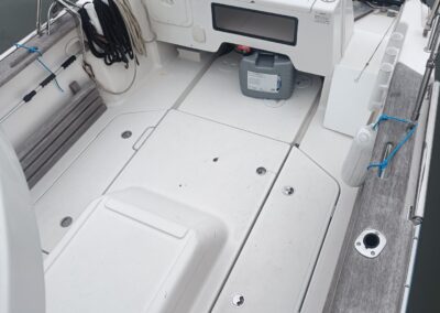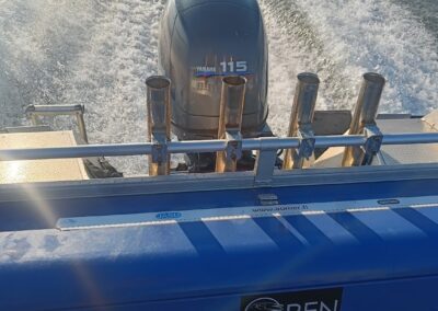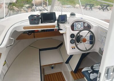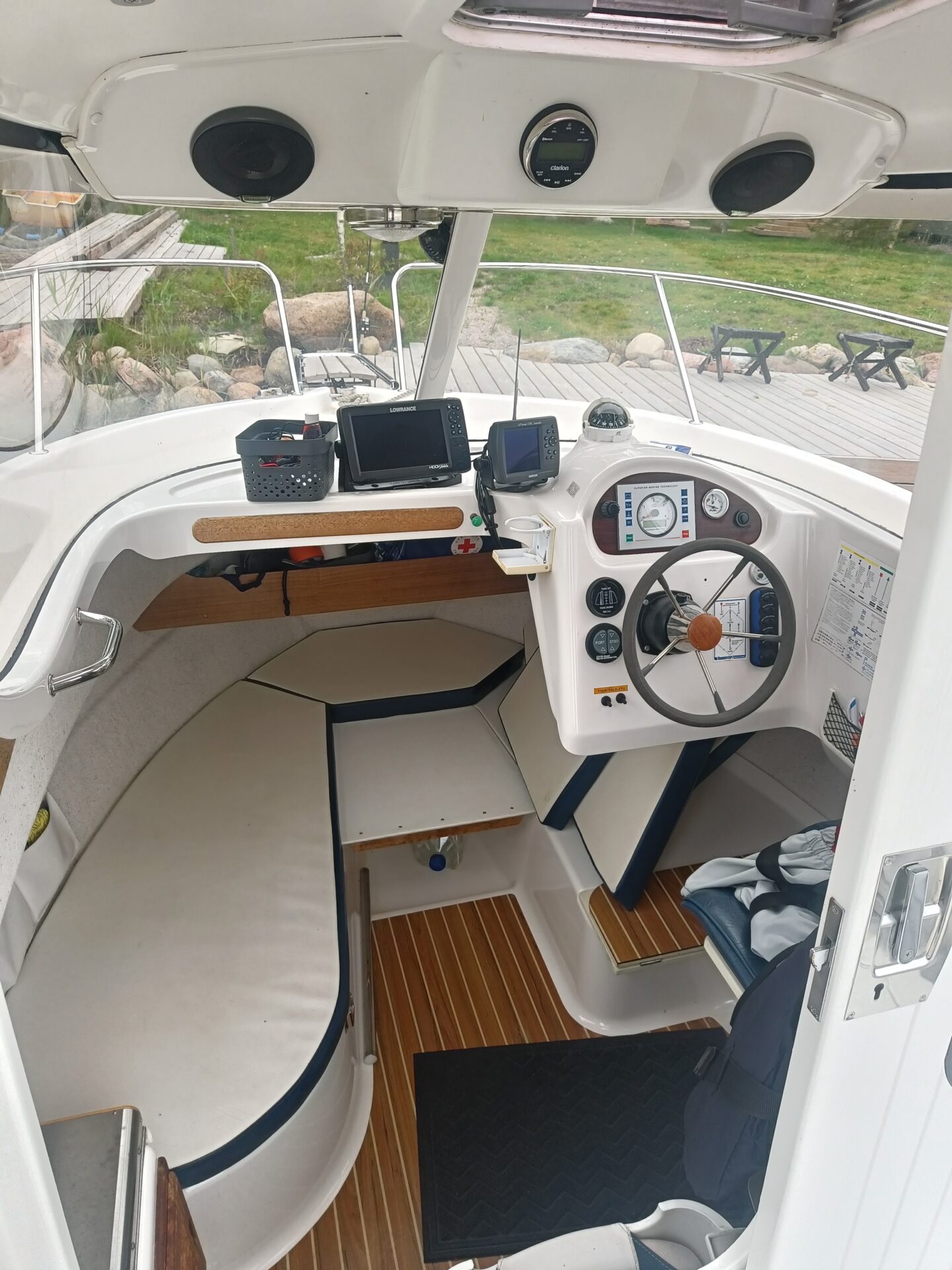 Veneessä on GPS-ohjattu keulan sähkömoottori, niin sanottu taivasankkuri, joka helpottaa paikallaan pysymistä kalastuksen aikana. Navigointia ja luotausta tukevat Garminin ja Lowrancen kaikuplotterit, ja turvallisuudesta huolehtivat kaikille matkustajille löytyvät kelluntaliivit. Voimasta vastaa Mercruiser 7,4 litran V8 isolohko, josta irtoaa 330 hevosvoimaa. Teho välittyy veteen Volvon vetolaitteen ja duoprop-potkureiden kautta, mikä takaa varman ja tehokkaan kulun.